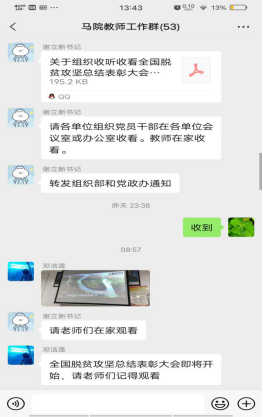 全国脱贫攻坚总结表彰大会的召开,是我国脱贫攻坚战取得全面胜利的庄严宣告,也标志着中华民族伟大复兴中国梦的实现取得了重要进展。全院教职工感受颇深,相互分享了观看大会盛况的心得体会。