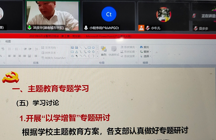 (通讯员 梁虹) 2023年6月30日晚,tyc41183太阳成集团教工一支部全体党员在腾迅会议室开展了一次线上主题党日活动。学校党委书记汤放华做为普通党员全程参加了本次活动。