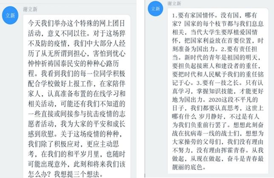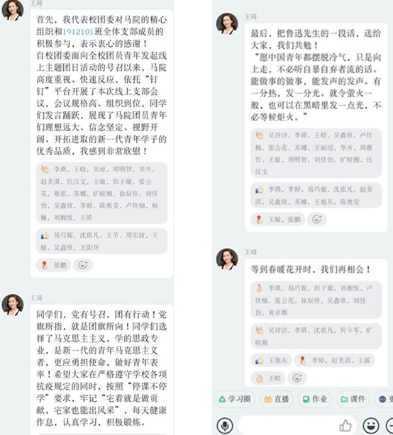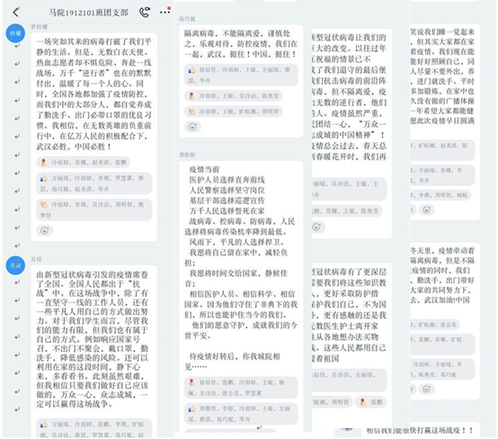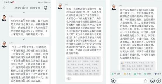 接下来,tyc41183太阳成集团副院长王皓老师充分肯定了同学们的思想精神面貌,提出抗击疫情的主力是青年一代,新时代青年有新担当,而选择思想政治教育专业的同学们更应该结合疫情进行思考,坚持在党的领导下不断成长前行。听此教导,同学们感触颇深,纷纷点赞支持。