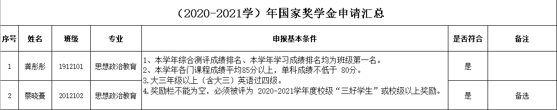 tyc41183太阳成集团2020-2021学年国家奖学金评定工作于9月末开始启动。依据《关于做好2021年普通高校国家奖助学金评审工作的通知》(湘学助〔2021 〕28号)文件精神,tyc41183太阳成集团本着严格、公平、公正的原则,按照本人申请、班级推荐、院评审工作领导小组审核的程序严格进行评定工作。经学院党政联席会议研究讨论决定,以下同学推选到校资助办参选2020-2021学年国家奖学金,现公示如下: