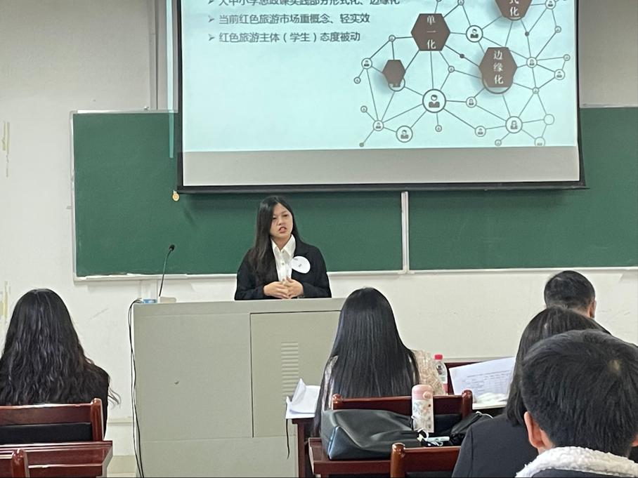 此次比赛有7组作品参赛,分别有沈款老师指导的、王小坤为负责人的《“许你心晴”: 专注心理健康的社会实践项目》,王锋娟老师指导的、李娜为负责人的《“青与红”大中小学思政游学》,杨化冰老师指导的、付晓媛为负责人的《安化黑茶文化线路与乡村旅游协同发展研究-以古梅山区域陆路段为例》,刘红星老师指导的、汪欣怡为负责人的《物物心移》,王刚老师指导的、吴昕怡为负责人的《红色立体文化工作室》,佟志阳、余生梅老师指导的、王芷琪为负责人的《“红烨简制”红色旅游景点创意产品主理人》,以及蒋丽红老师指导的、肖寒冰为负责人的《新时代乡村建设的生态空间治理调研》。每组选手答辩时间为8分钟,前5分钟为PPT演示,后3分钟为答评委提问。在《“青与红”大中小学思政游学》答辩时,夏建文肯定了选手让思政课堂活起来的想法,但提出要防止思政课堂娱乐化。后面的选手继续提出“物物心移”、“红色立体书”以及“安化黑茶文化线路与乡村旅游协同发展”等项目,想法新颖,可圈可点。