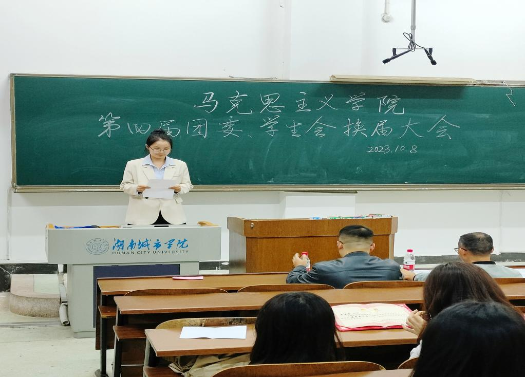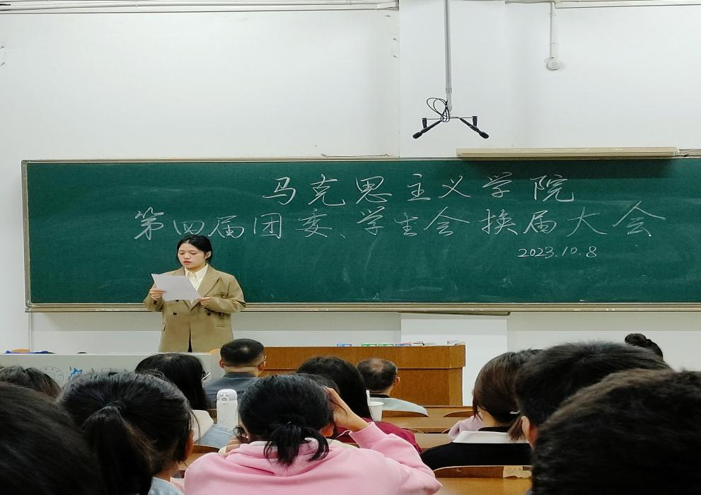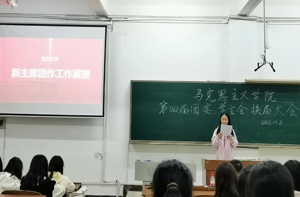 会议第二项议程,由马院原学生会主席团代表李诗琪作上一年度工作报告。她提到在上一年度中,在院党总支的领导、院团委的指导和全体学生干部的共同努力下,院团委、学生会、学生社团顺利完成了各项工作任务。她希望新一届团委、学生会、学生社团成员能够接续奋斗,以饱满的热情、强烈的责任心和服务意识投入到工作中,为学院建设添砖加瓦。