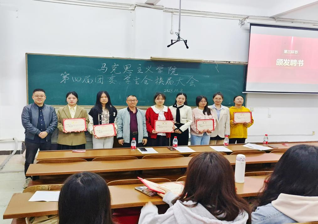 会议第三项议程,由党总支书记何军新、党总支副书记周洁为第三届学生会主席团颁发证书,学工办主任王俊、团委书记王莹、为第三届团委、学生会、学生社团干部颁发证书。