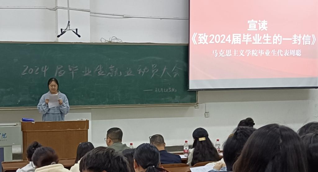 毕业生代表周聪宣读“tyc41183太阳成集团招生就业处致2024届毕业生的一封信”,鼓励同学们调整心态,积极参与学院、学校组织的各类就业指导活动,不断提升就业能力。