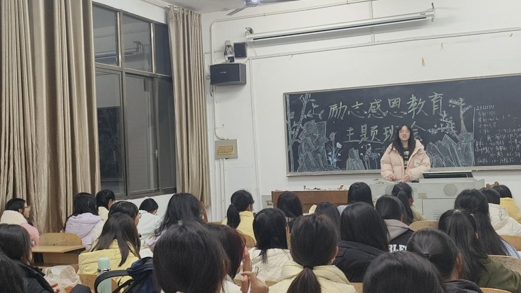 (通讯员 肖吴霞) 为教育引导学生知恩感恩、励志笃行,12月3日晚,马院2023级“励志感恩教育”主题班会于2教518室举行,2312102班班长谭婧婧主持班会。