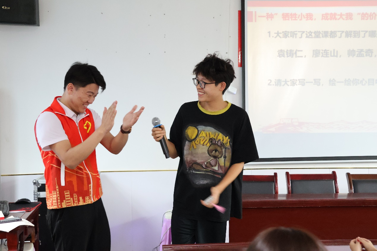 在集中宣讲环节,成员们生动讲述了益阳市著名的丰堆仑革命旧址在早期党组织进行地下革命中背后的故事,介绍了一代革命先驱帅孟奇面对敌人酷刑施压的坚贞不屈和大义凛然的英雄气概,分享了无私奉献的革命精神和牺牲小我、成就大我的价值观,号召大家身为新时代的青少年,要培育吃苦在前、享受在后的宝贵品质,甘于奉献,为实现中华民族伟大复兴的中国梦贡献自己的力量。为了增强宣讲的互动性和感染力,实践团特设了一个创新环节——“心中的英雄”艺术创作。在这个环节中,实践团成员引导同学们拿起画笔,描绘他们心目中的英雄形象,并鼓励他们在画作旁写下自己对英雄的敬仰之情和对红色精神的理解。同学们用心创作并上台分享,一幅幅充满创意和感情的作品展现了他们对革命先烈的深切敬意。其中一位男生与大家分享了他心中的英雄——周恩来的故事,并表示“革命先烈的伟大和牺牲令人敬佩,今后会继承和发扬革命先辈的光荣传统,珍惜当下来之不易的和平生活。”